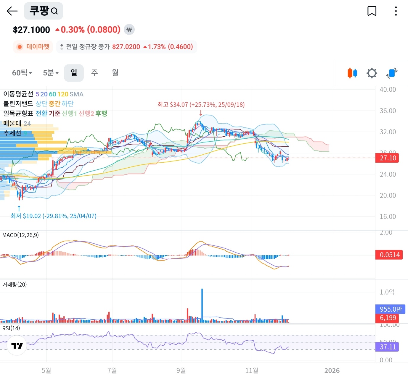 지금 쿠팡은 “전환선 골든크로스 시도 중 + 두꺼운 구름대 저항” 구간이야.