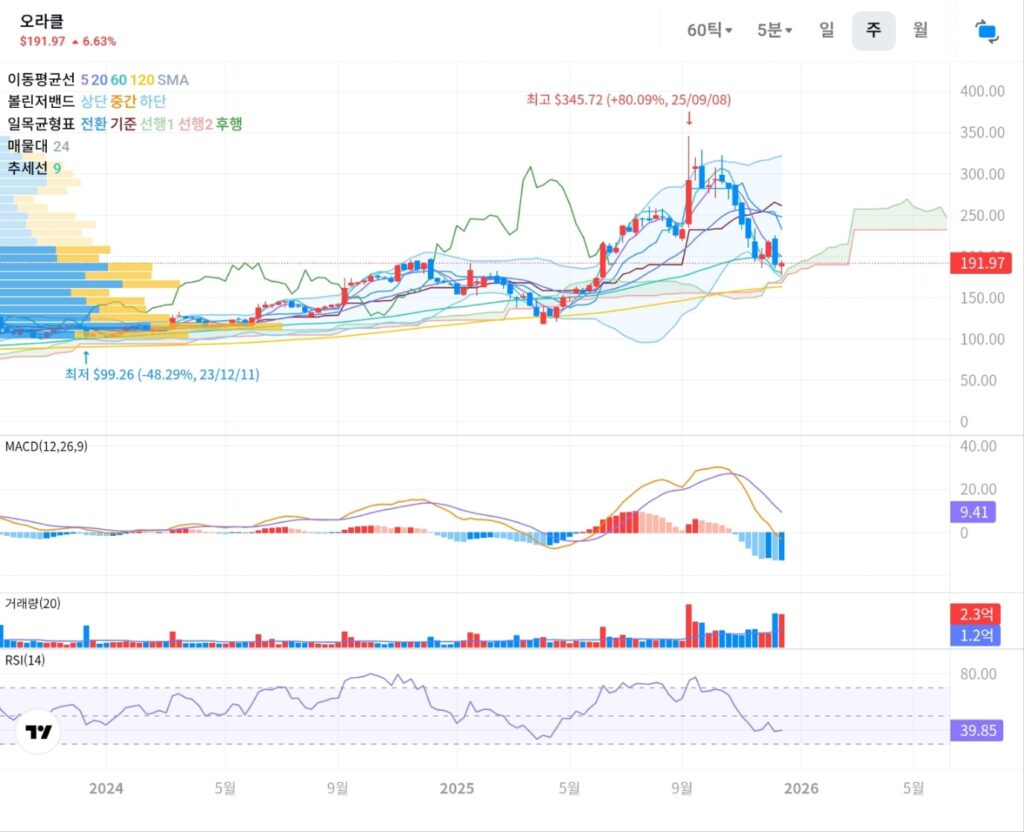 주봉으로 넓게 봐도 상황은 비슷해. 장기 우상향 추세 속에서 겪는 뼈아픈 조정이지만, 장기 이평선 부근까지 내려오며 가격 메리트가 발생한 구간이지. 특히 오라클이 주도하는 틱톡(TikTok) 미국 사업권 인수 모멘텀은 단순한 이슈를 넘어 오라클 클라우드(OCI)의 매출 체급을 완전히 바꿔놓을 수 있는 실질적인 변화야.