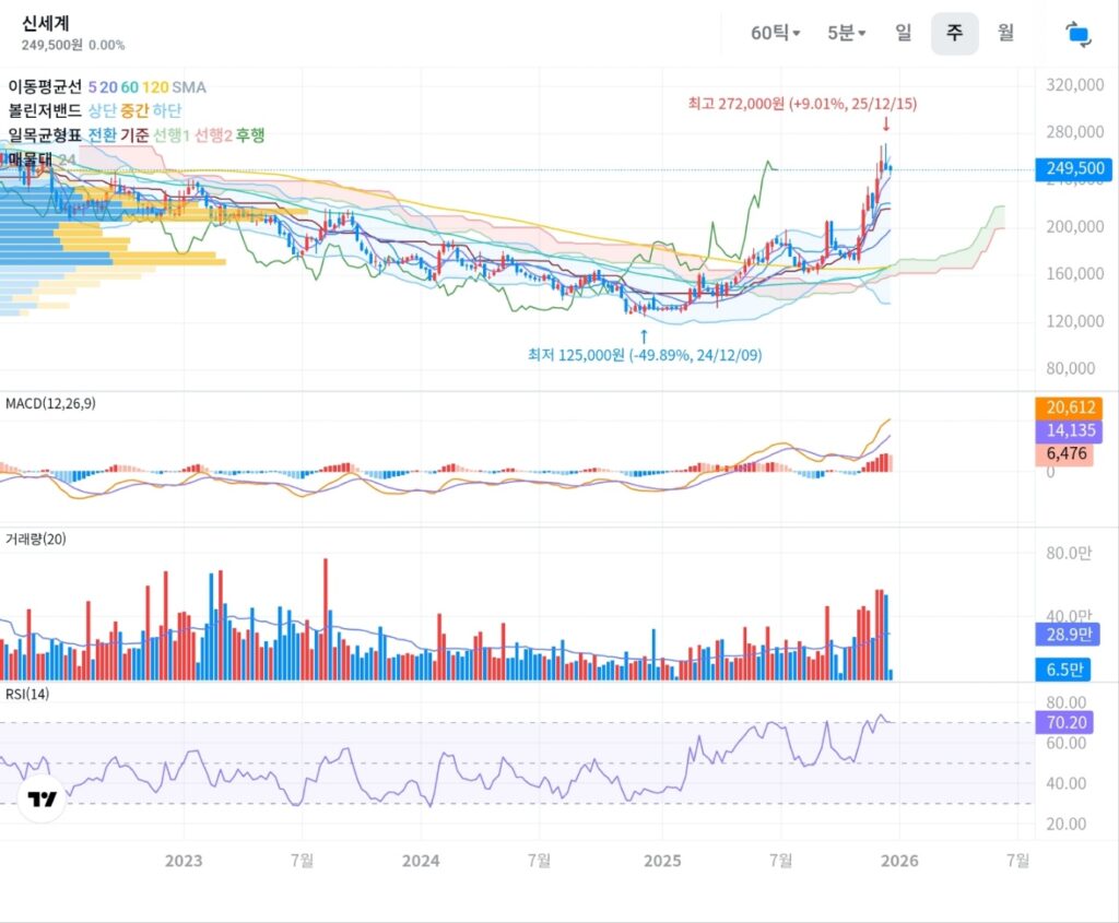 - 주봉: 전고점 272,000원(+9.01%, 25/12/15) 이후 조정, 현재 249,500원. RSI 70.20으로 과열 신호가 켜져 있음.