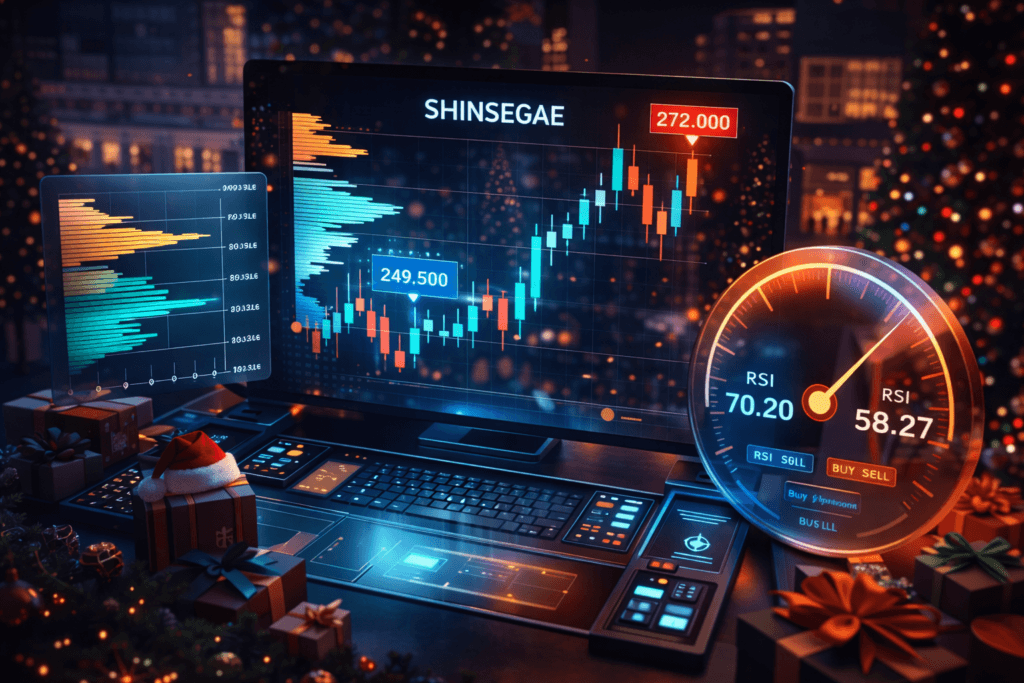 산타랠리 시즌에 소비주 흐름이 붙을 때, 신세계 차트에서 RSI·매물대·이평선이 어떻게 겹치는지 한 번에 정리해뒀어.