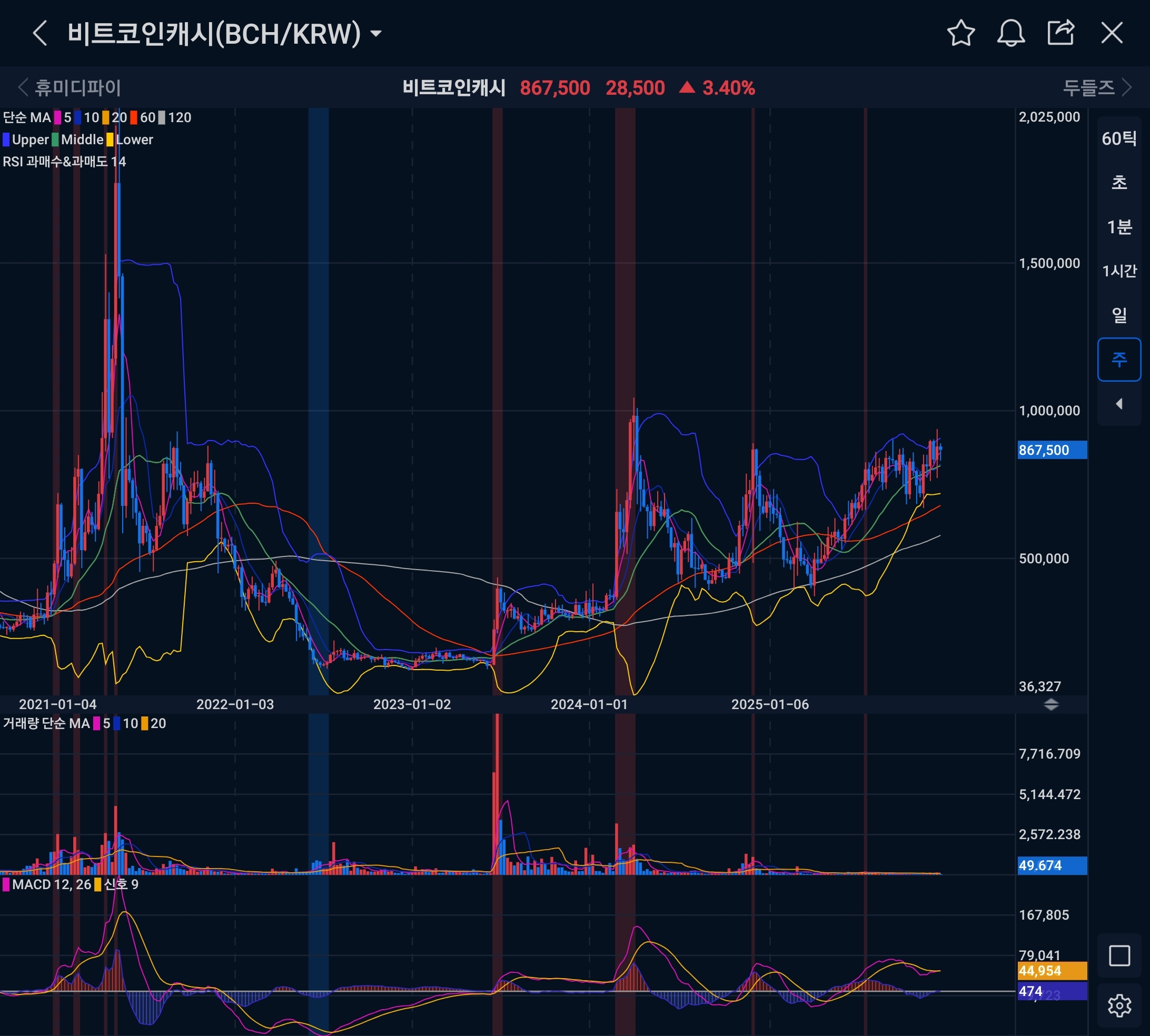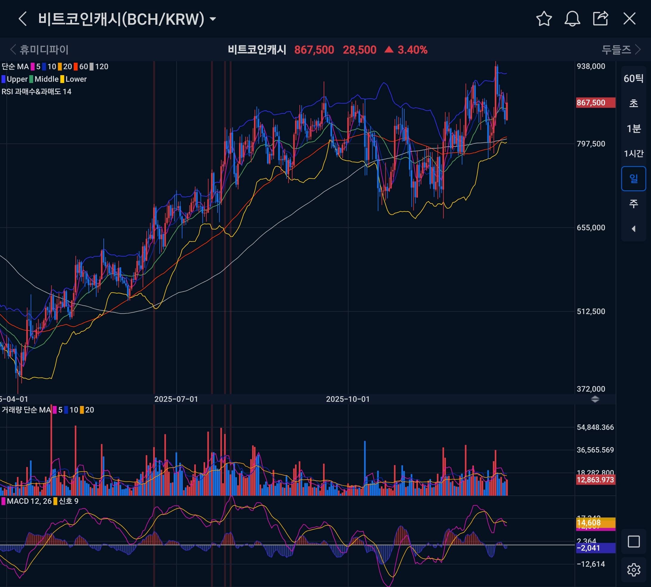 과거 버블 피크 때처럼 거래량이 폭발하는 게 아니라, 상대적으로 적당한 거래량을 동반한 파동형 상승이 반복되고 있어. MACD도 저점 대비 위쪽 레벨에서 파동을 만들며 에너지가 상향 이동한 상태야.