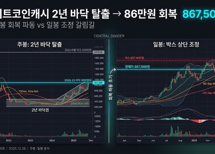 비트코인캐시는 지금 “2년 바닥 탈출 후 회복 파동 초기”와 “박스 상단 조정 시그널” 사이에서 갈림길에 서 있어. 주봉 차트를 보면, 2021년 200만원 버블 붕괴 후 2022~2023년 30만원대 전후에서 긴 바닥권 횡보를 거쳤고, 2024년부터 저점대를 벗어나 현재 86만원대까지 회복한 상태야. 20·60주선 위 안착 시도와 60·120주선 기울기 완만화는 “장기 하락장 탈출 초기” 신호로 볼 수 있어.