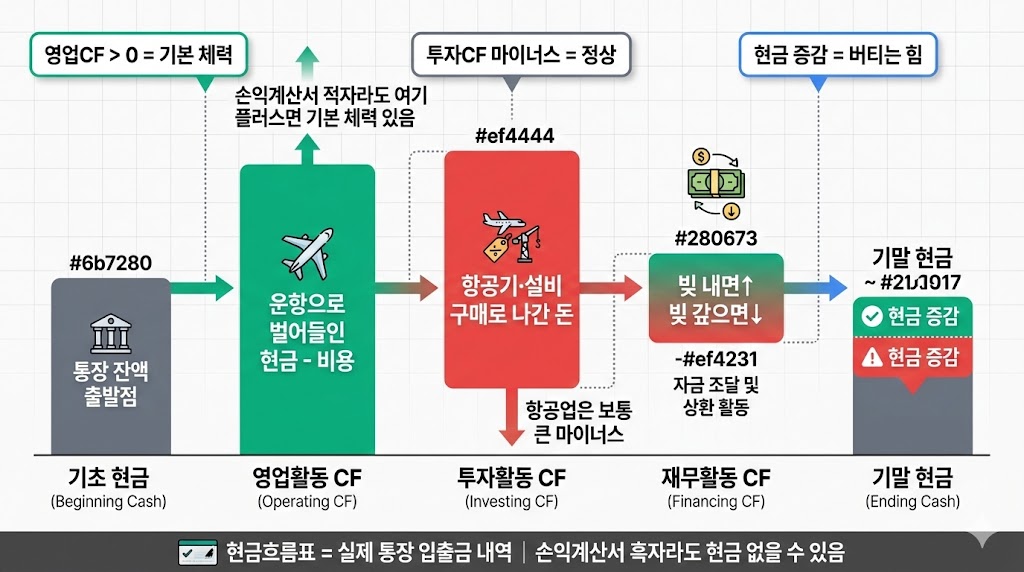 손익계산서에서는 흑자라도, 실제 통장에 현금이 없을 수 있어. 현금흐름표는 “영업 활동으로 돈이 얼마 들어왔는지, 투자·차입으로 돈이 얼마 나갔는지” 계좌 입출금 내역처럼 보여주는 표야.
