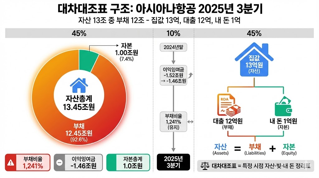 대차대조표에서는 “자산 대비 부채가 얼마나 많은지, 이익잉여금이 플러스인지 마이너스인지”를 확인해. 아시아나는 자산 13.4조 중 부채 12.4조, 이익잉여금 –1.4조야. “집값 13억, 대출 12억, 내 돈 1억”이라고 생각하면, 재무 구조가 튼튼하다고 보긴 어려워.