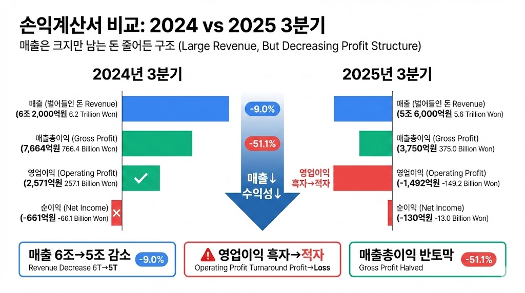 - 손익계산서 한 장으로 보는 ‘돈 버는 힘’: 2024년 3분기 누적 매출 6조 2,015억 원에서 2025년 3분기 5조 6,426억 원으로 줄었고, 같은 기간 영업이익은 2,571억 원 흑자에서 1,492억 원 손실로 바뀌어 “매출 규모는 큰데 남는 돈은 줄어든 상태”다.