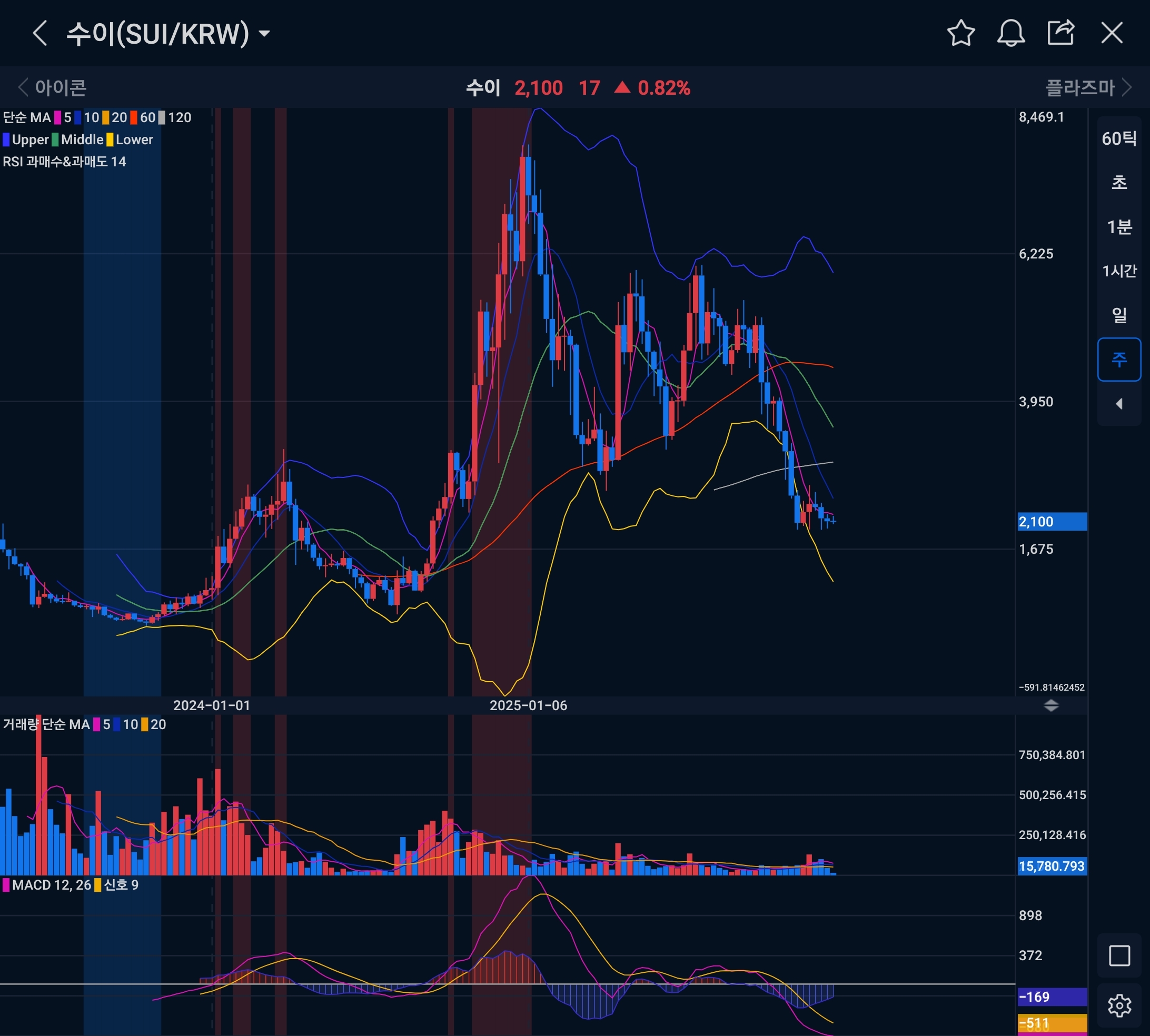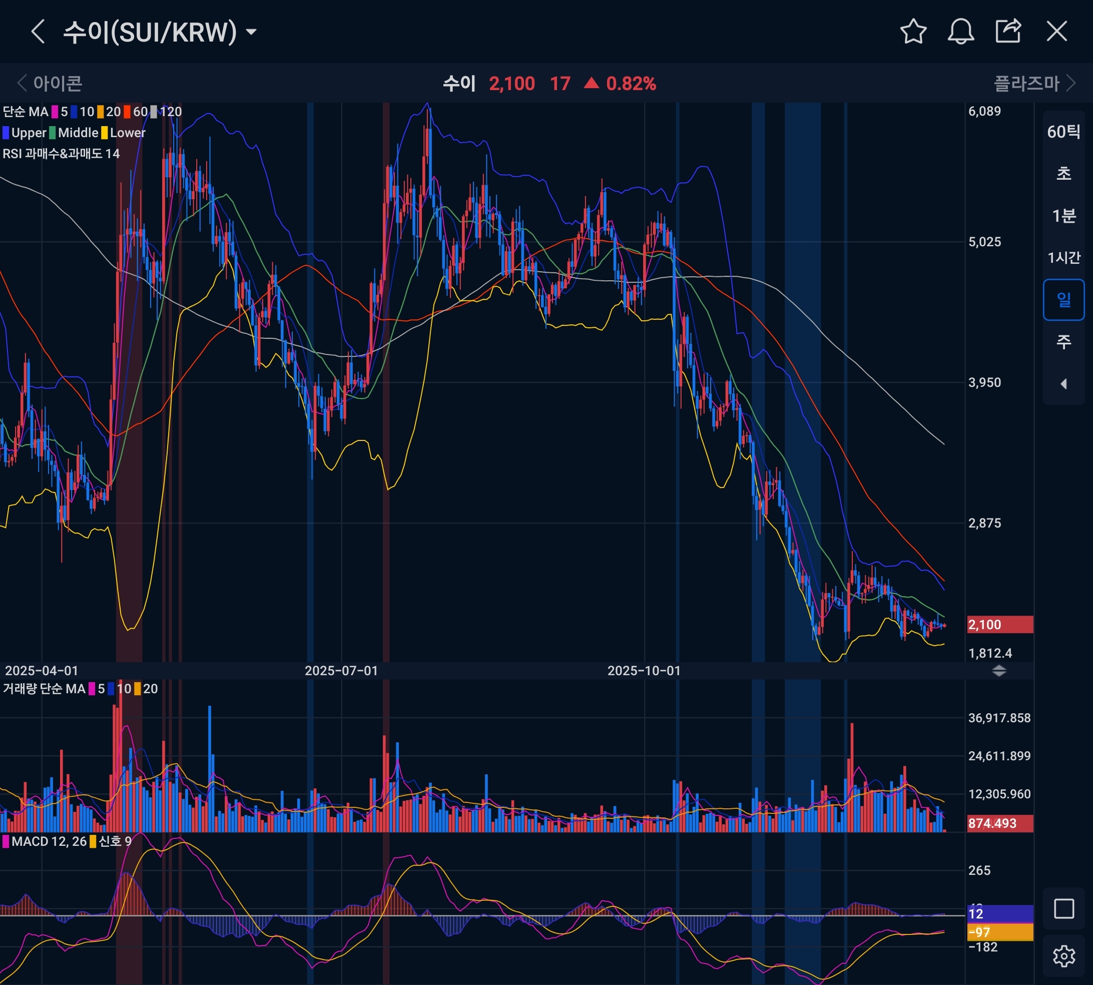 수이는 2025년 1월 초 8,469원에서 12월 31일 현재 2,100원까지, 고점 대비 -75% 하락했어. 그 중심엔 알트코인 전반 약세·토큰 언락 우려·경쟁 레이어1 압박이 있었지. 하지만 지금은 일봉·주봉 모두 명확한 하락 추세 안에 있어.
