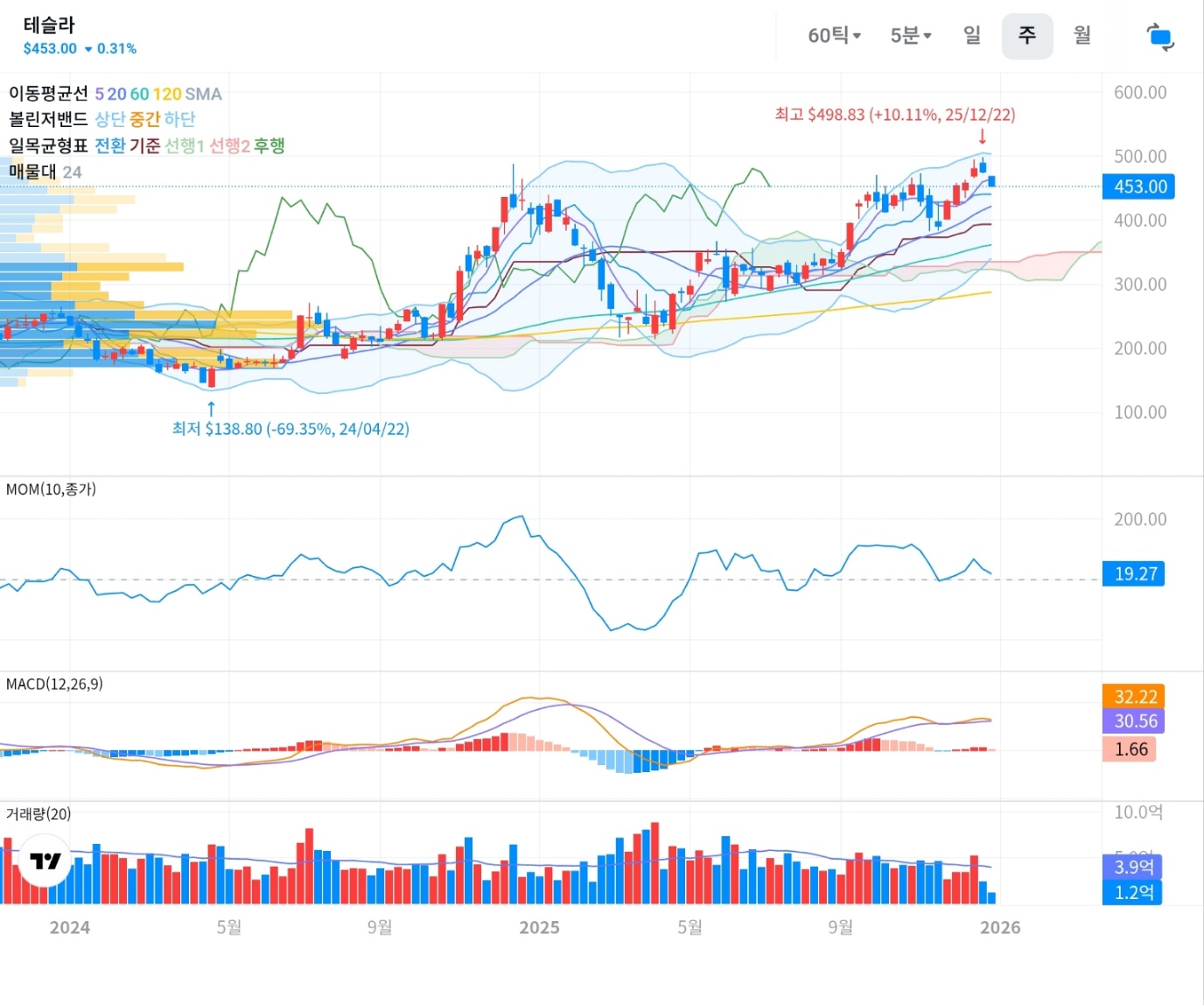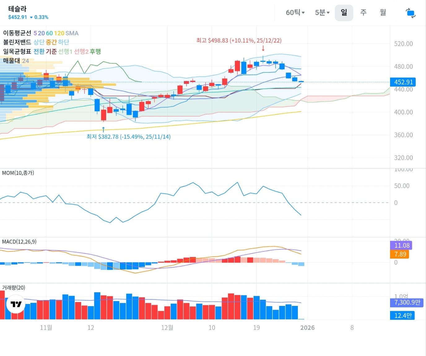 그런데 12월 마지막 주, 이 랠리가 숨을 고르기 시작했어. 498달러 신고가 직후 볼린저밴드 상단에서 이탈하며 450달러 초반까지 눌렸고, 일봉·주봉 모두 모멘텀 지표가 피크 아웃 신호를 보내고 있어. EV 판매 둔화·배터리 공급 계약 축소·유럽 수요 약세 같은 펀더멘털 리스크도 겹치면서, “장기 강세 속 단기 피로 조정”이 시작된 구간이야.