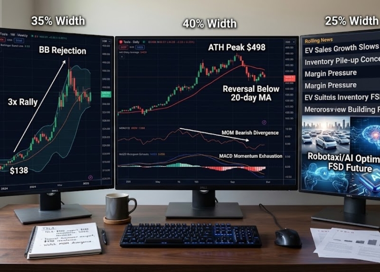 Tesla surged from $138 (April 2024 low) to $498 (December 22, 2025 all-time high) on robotaxi/AI optimism, FSD expansion, and Optimus robot potential—a near 3x rally. However, post-peak price action shows classic momentum exhaustion: daily chart broke above Bollinger upper band at $498 then reversed below 20-day MA toward $450, with MOM(10) forming lower high vs price (bearish divergence) and MACD histogram contracting toward dead cross = “normal pullback after steep rally.”