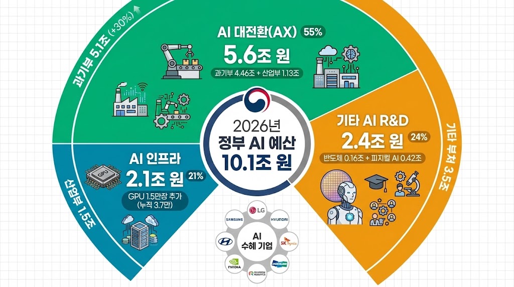- 2026년 AI 예산 팩트 — 총 10.1조 원(과기부 5.1조 +30%, 산업부 1.5조, 기타 3.5조), 최대 투자는 AI 대전환(AX) 5.6조 원(55%)으로 제조업 AI 도입 집중, AI 인프라 2.1조(GPU 1.5만 장 추가, 누적 3.7만 장), 기타 AI R&D 2.4조(AI 반도체 0.16조, 피지컬 AI 0.42조 포함)