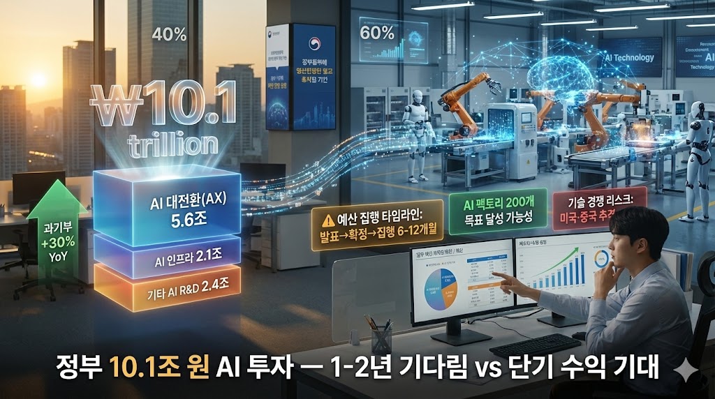 정부 예산은 발표→확정→집행까지 6개월~1년 소요된다. 2026년 AI 예산 10.1조 원 발표가 2025년 8월이었다면, 실제 집행은 2026년 상반기다. 발표 시점에 테마주가 급등하지만, 실제 돈이 기업에 들어가는 건 그보다 훨씬 나중이다.