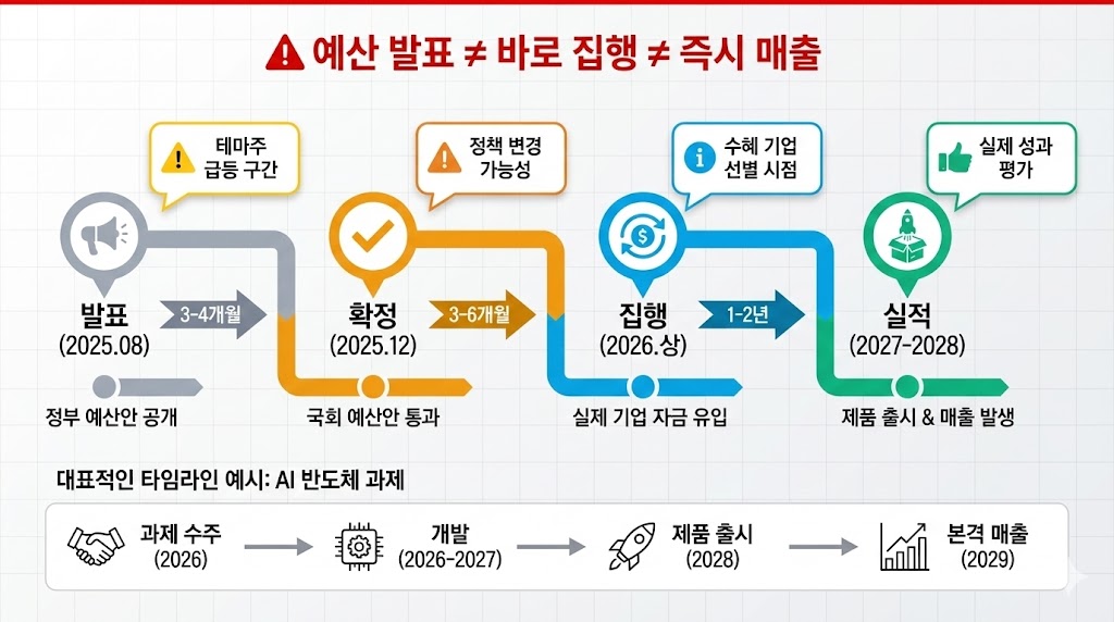 발표(2025.08) → 확정(2025.12) → 집행(2026.상) → 실적(2027~2028). 발표 시점 테마주 급등하지만, 실제 집행은 6개월~1년 후. 제품화·매출은 2~3년 후.