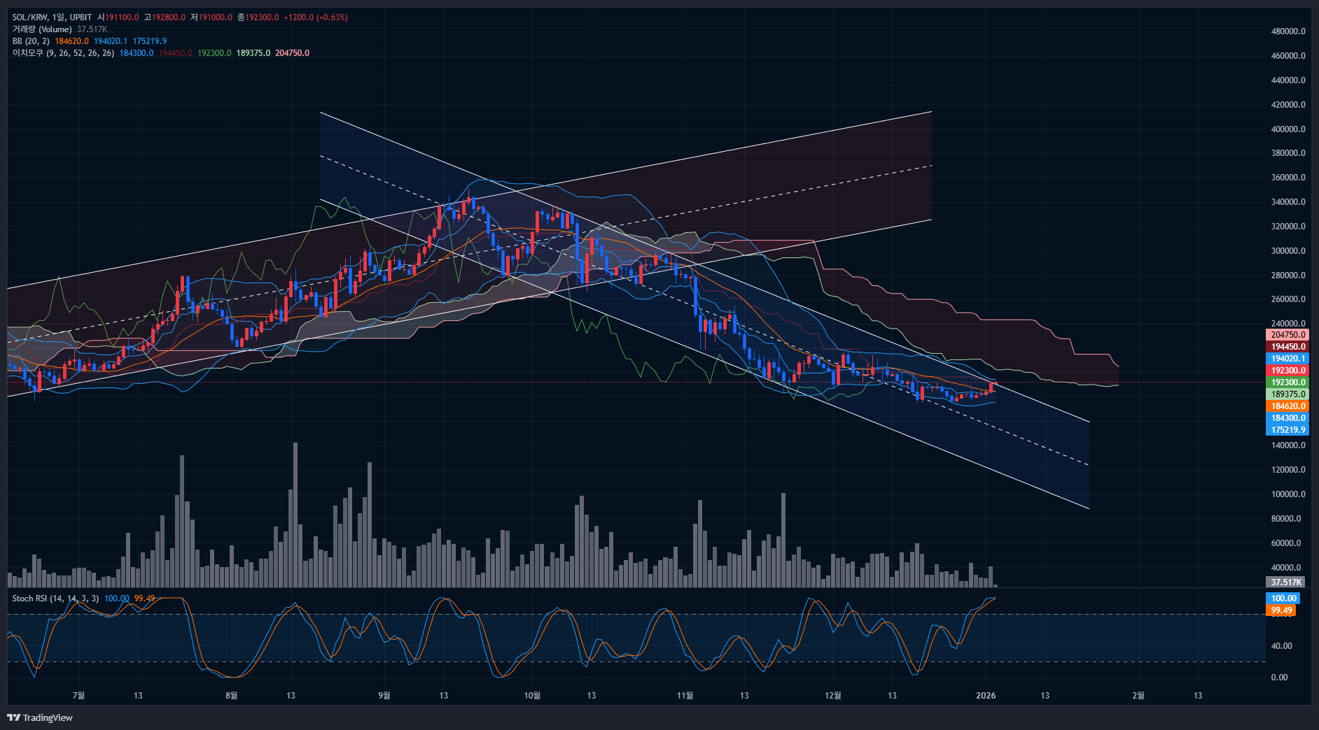 지금 솔라나 일봉 차트에 그려진 하락 채널을 보면, 최근 고점들을 이은 우하향 상단선과 최근 저점들을 이은 우하향 하단선이 거의 평행이야. 그리고 캔들이 그 안에서 여러 번 튀고 눌리며 움직이는 모습이라 기본 정의에 잘 맞아.