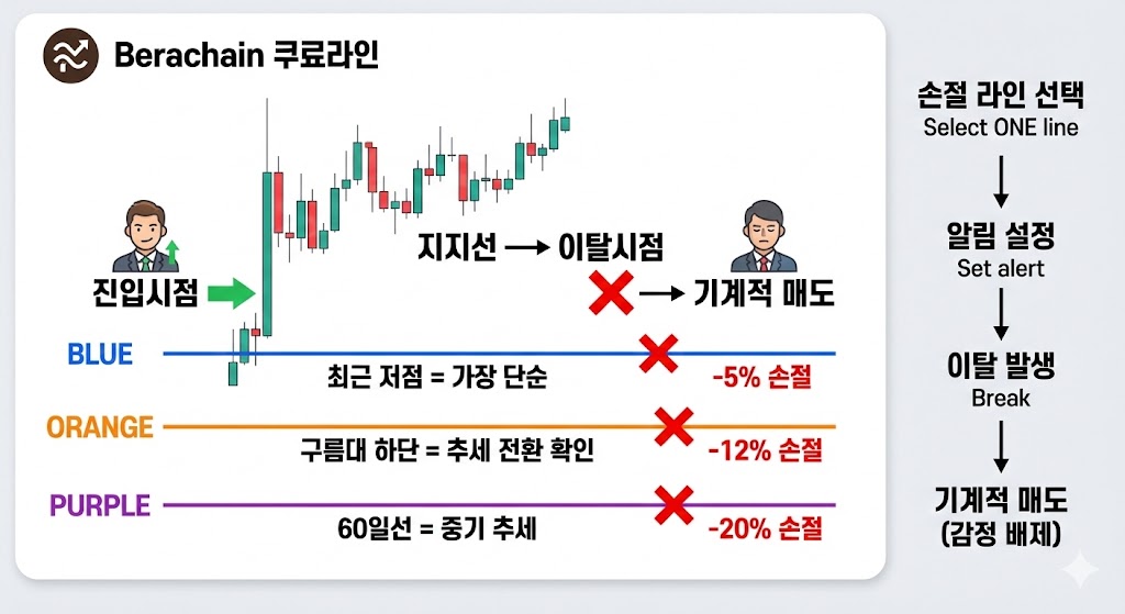 손절라인은 복잡하게 잡을 필요 없다. 아주 단순한 규칙 하나만 정하면 된다. “매수 후 최근 저점·구름대 하단·60일선 중 하나를 정해서, 그 선이 깨지면 기계적으로 정리”하는 것이다.