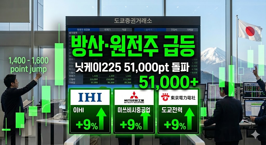 • 닛케이225 51,000~52,000pt 진입(+3%), 장중 1,400~1,600pt 갭 점프 · IHI·미쓰비시중공업 +9% 안팎 방산·원전·에너지 인프라 재평가 서사