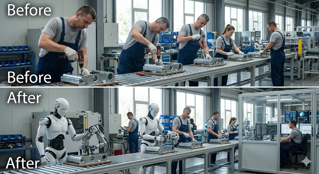 지금은 “사람 1명 = 하루 8시간 노동”이 기본 단위지만, 휴머노이드가 들어오면 “사람 1명 + 로봇 몇 대”가 한 팀을 이룬다. 사람은 위험하거나 반복적인 작업에서 점점 빠져나와 설비 운용·품질 관리·정비 쪽으로 이동하고, 로봇은 단순·고강도 작업을 맡는 구조가 된다.