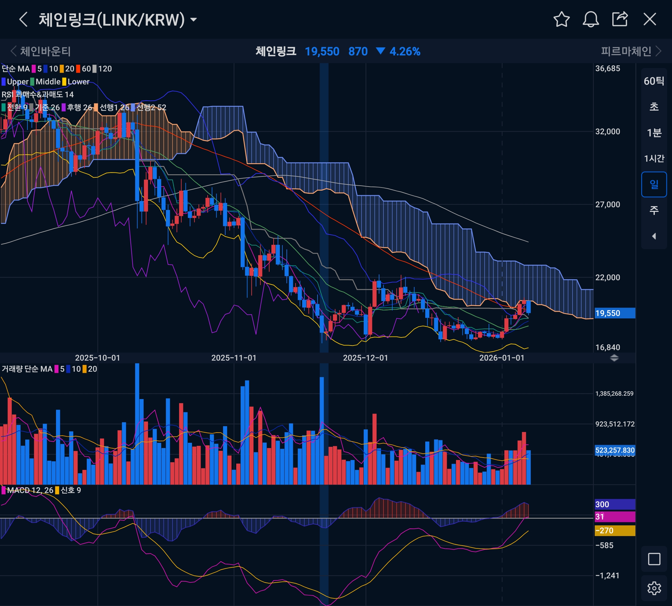 일목균형표 구름대와 200일 이동평균선은 장기 추세를 나타내는 핵심 지표로 해석된다. 현재 체인링크는 이 두 선 아래에 있어 “하락 추세 안에 있다”는 신호로 받아들여지고 있다. 시장에서는 일봉 기준 구름대 재진입(2.2만원 위 안착) + 거래량 동반 여부를 추세 전환 신호로 관찰하는 경향이 있다.