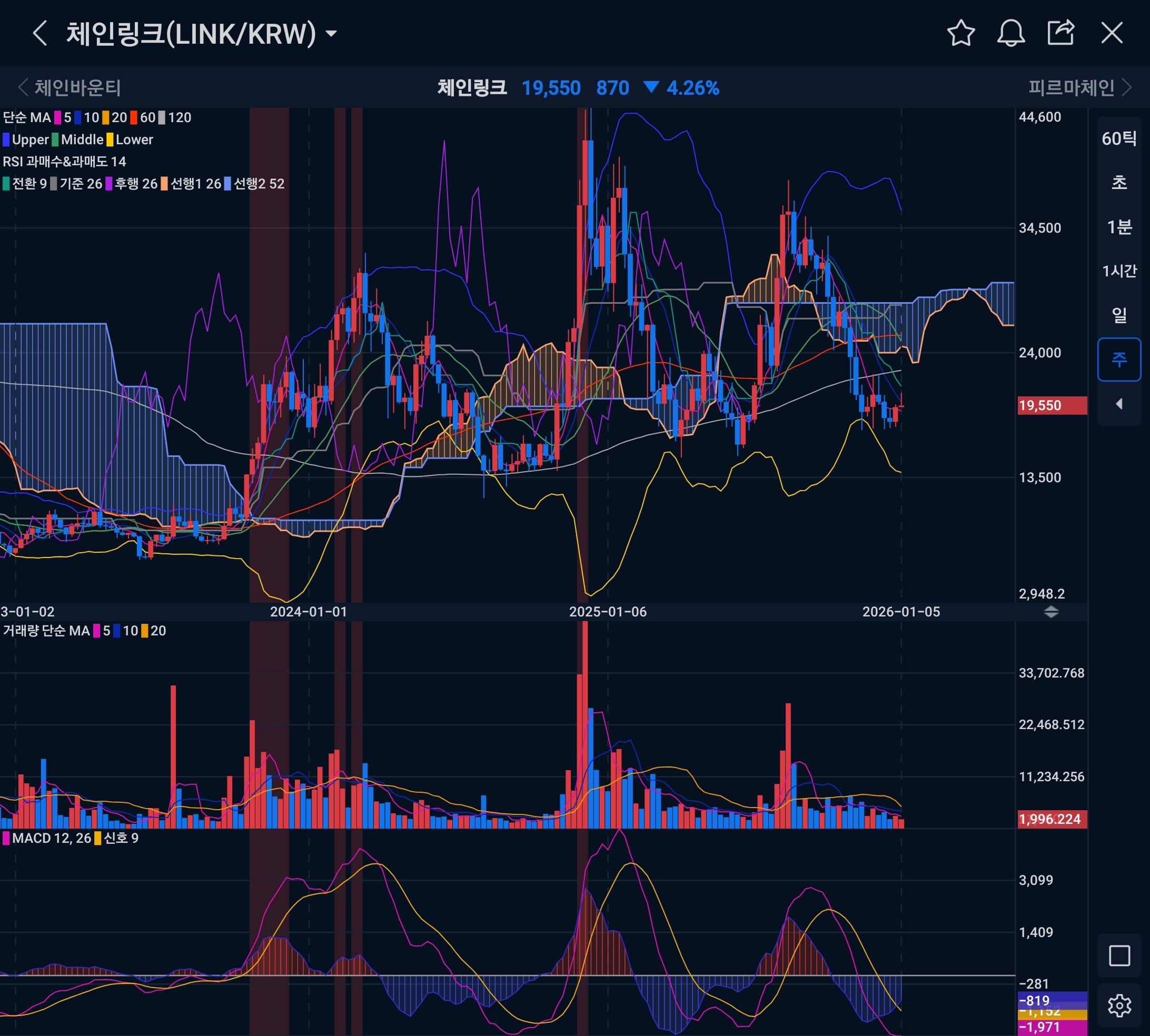 체인링크는 SEC ETF 승인이라는 구조적 호재를 받았지만, KRW 차트 상으론 아직 하락 추세 속 ‘초기 바닥 다지기’ 단계로 해석되는 구간이다. 일봉은 구름대·200일선(2.2만~2.3만원) 아래 있고, 지금 19,550원은 1.7만원 저점에서의 기술적 반등으로 보는 시각이 많다. 주봉으로 보면 2024~25년 3~4만원 피크 이후 고점·저점이 계속 낮아지는 전형적 하락 추세 패턴이다.
