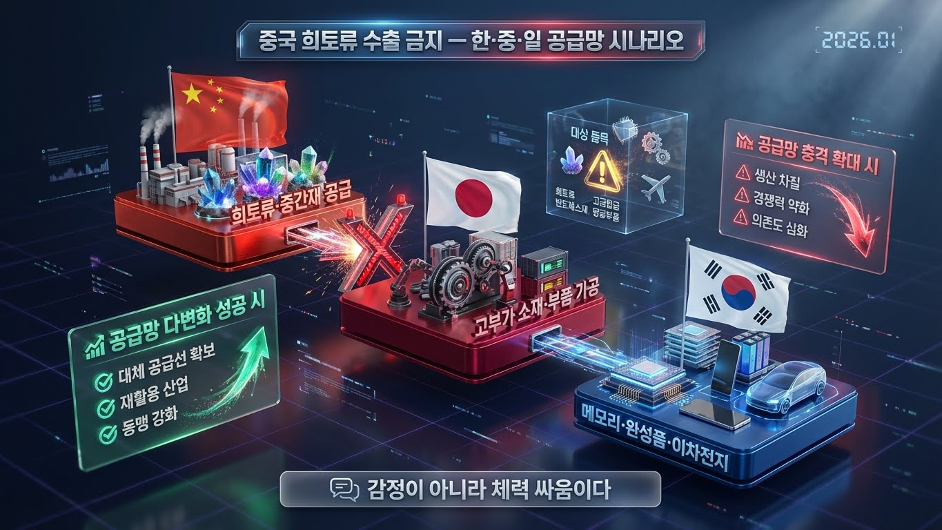 동북아 제조업 공급망은 대체로 **중국(자원·중간재) → 일본(고부가 소재·부품) → 한국(메모리·완성품)** 흐름으로 짜여 있다. 한국은 희토류의 상당 부분을 중국에서 들여오고, 그중 일부는 일본에서 가공된 소재·부품 형태로 다시 수입한다. 중국이 일본을 조일 경우, 일본 제조업이 흔들리고, 그 여파가 한국 전자·자동차·이차전지·방산까지 번질 수밖에 없다.