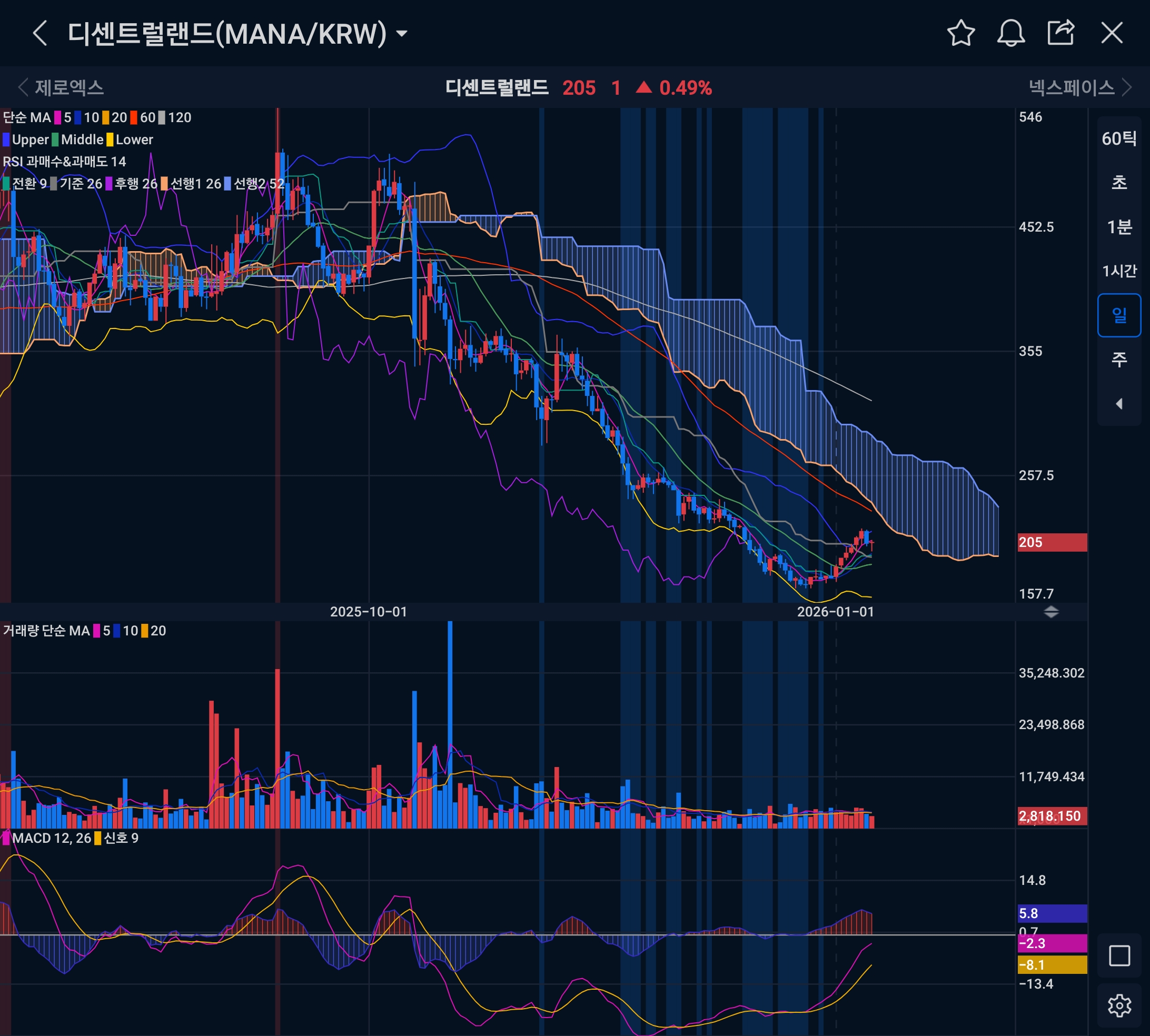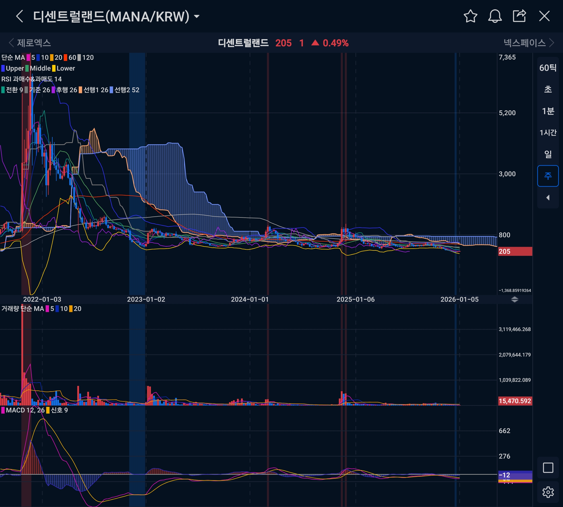 Decentraland (MANA) surged during the 2021-22 metaverse bubble but has been in a long-term downtrend for nearly three years, currently trading at 205 KRW (+0.49%), down over -97% from its all-time high of 7,365 KRW. The weekly chart shows a classic post-bubble “zombie phase” with declining volume and all major moving averages acting as resistance.