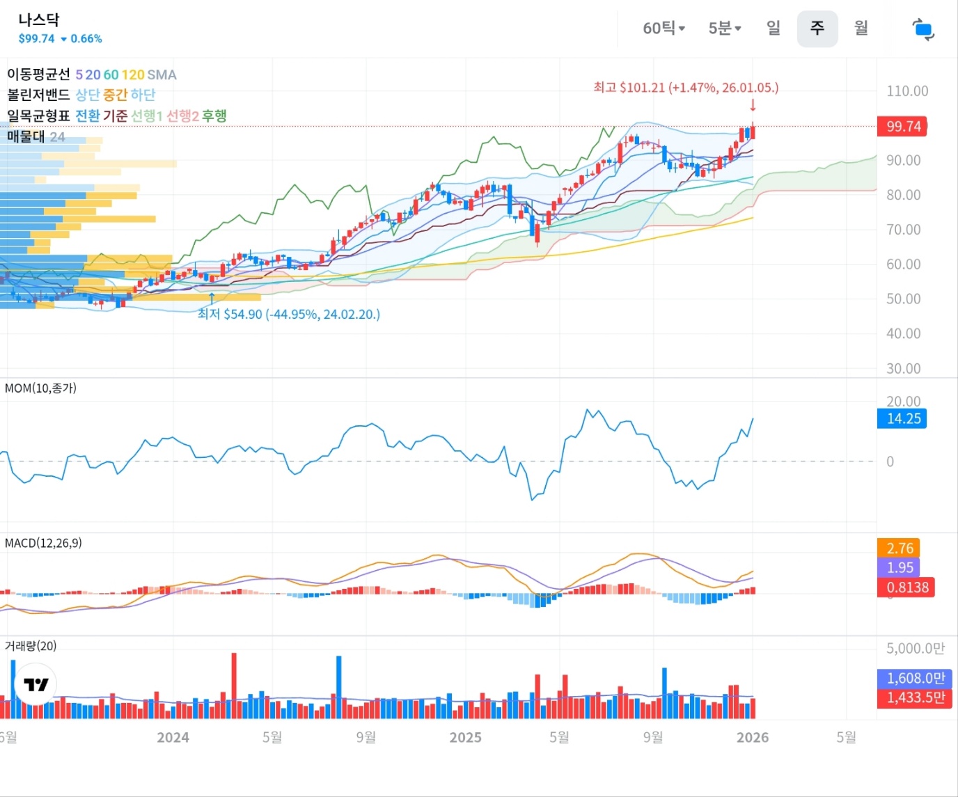 ์ฃผ๋ด์ผ๋ก ๋ณด๋ฉด ๋์ค๋ฅ์ 2024๋ ์ ์ 54.90์์ 2026๋ 1์ 101.21๊น์ง ์ด์ด์ง๋ ์ฐ์ํฅ ์ถ์ธ๋ฅผ ์ ์งํ๊ณ ์๋ค. 20์ฃผ์ (ํ๋์ ), 60์ฃผ์ (๋ถํ์ ), 120์ฃผ์ (์ด๋ก์ ) ๋ชจ๋ ์์์ ์์ง์ด๊ณ ์์ด, ๊ตฌ์กฐ์ ์ผ๋ก๋ ์ฌ์ ํ ์์น ์ถ์ธ ์์ ์กฐ์ ์ ๊ฐ๊น๋ค.