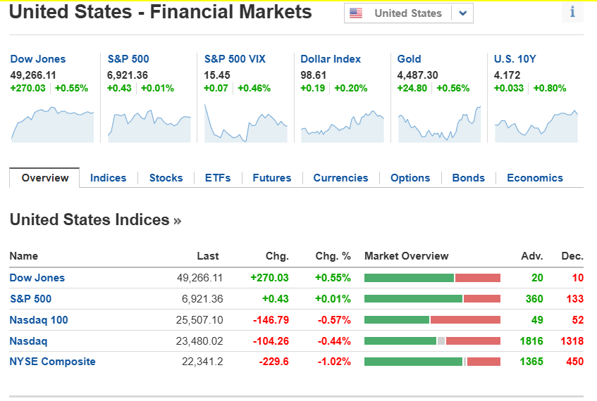 - 다우존스: 49,266.11 (+270.03, +0.55%) — 대형 가치주 버팀
