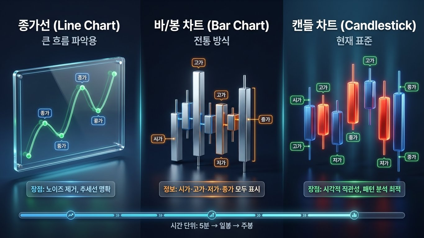 - 종가선·바/봉·캔들 3가지 방식이 있으며, 캔들이 현재 가장 보편적