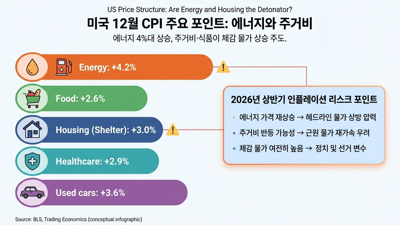 - 에너지·주거 물가 불안: 에너지 지수 4.2% 상승(휘발유 0.9%, 난방유 11.3%, 천연가스 9.1%), 주거비 3.0% 상승으로 2026년 상반기 인플레 경로 재가속 뇌관 존재