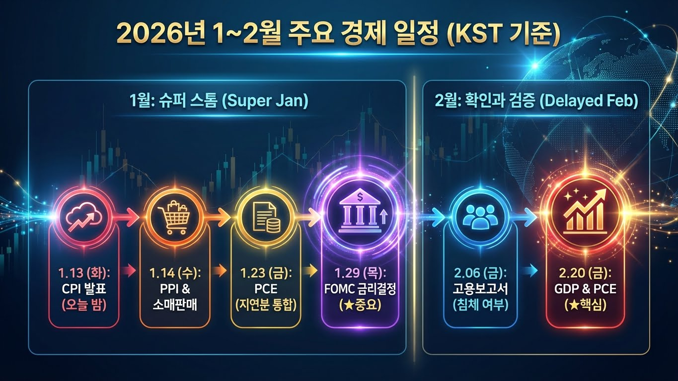 2026년 1~2월은 말 그대로 이벤트 러시다. CPI에서 시작해 PPI·소매판매·PCE·FOMC·고용·GDP로 이어지는 연속 발표 구간에서, 시장은 한 번의 숫자로 방향을 확정하지 않는다. 대신 “앞선 지표가 예상과 맞았나 → 다음 지표 기대치를 어떻게 조정하나 → 연준이 이걸 어떻게 해석할까”라는 3단계 순서로 시장 심리가 움직인다.