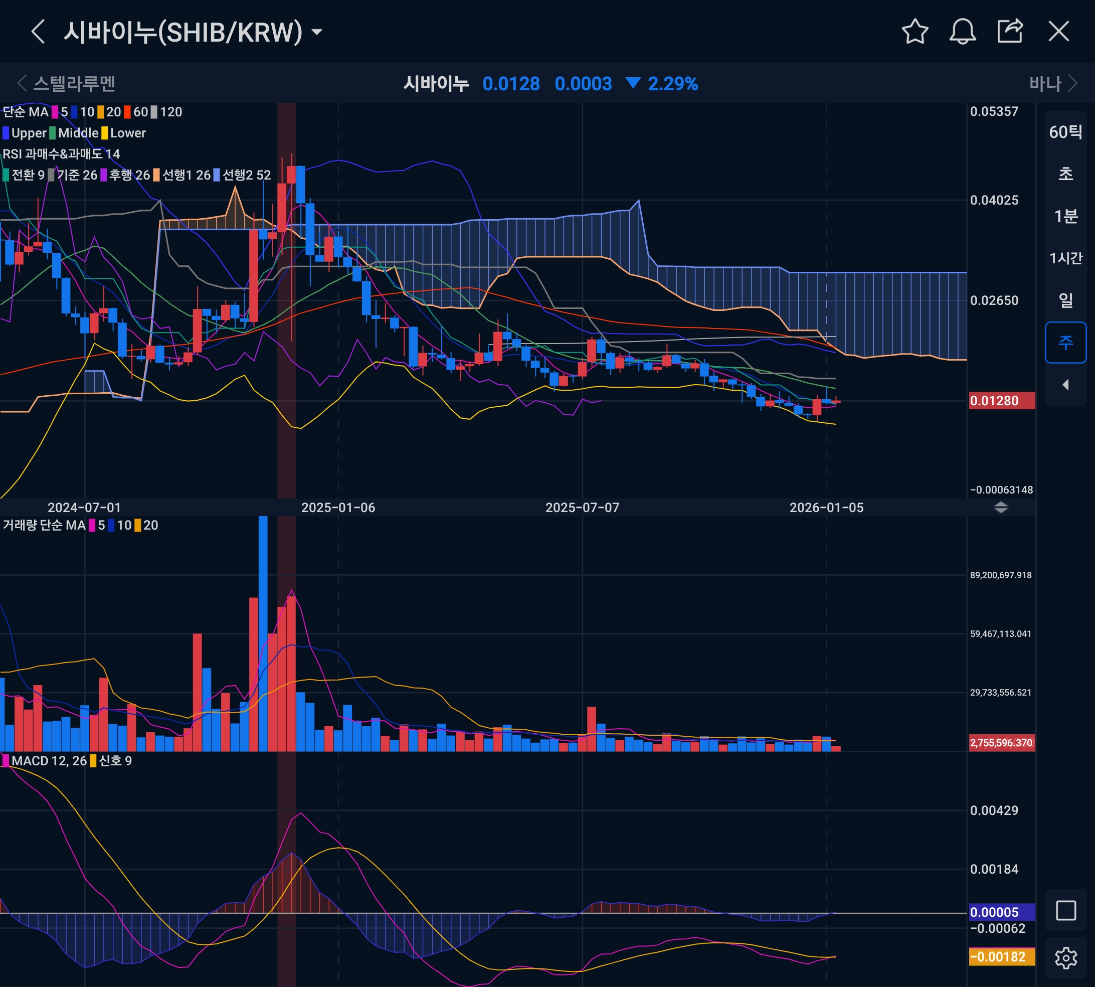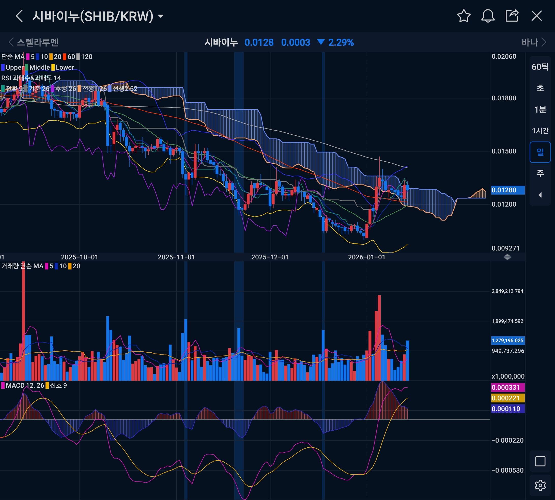 시바이누는 2026년 1월 초 25% 급등하며 밈코인 섹터 랠리에 합류했지만, 기술적 구조는 여전히 중장기 하락 추세 안에 있다. 주봉 역배열, 일목구름 저항 재확인, 거래량 급감, MACD 재차 약세 전환 등은 모두 이벤트성 반등 이후 모멘텀이 약화되는 전형적인 신호다.
