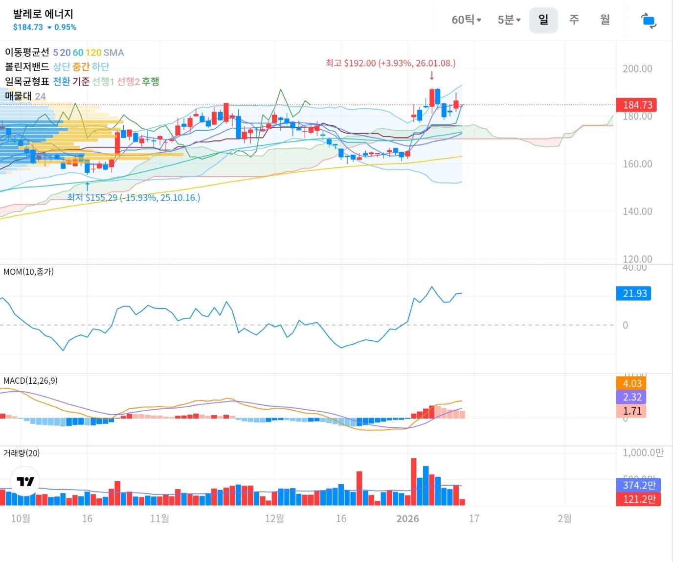 - 차트 구조: 1월 3일 베네수엘라 뉴스 이후 99달러→192달러 랠리(+94%), 현재 184.45달러에서 5·20·60일선 정배열 + MACD 골든크로스 유지하며 단기 조정 중