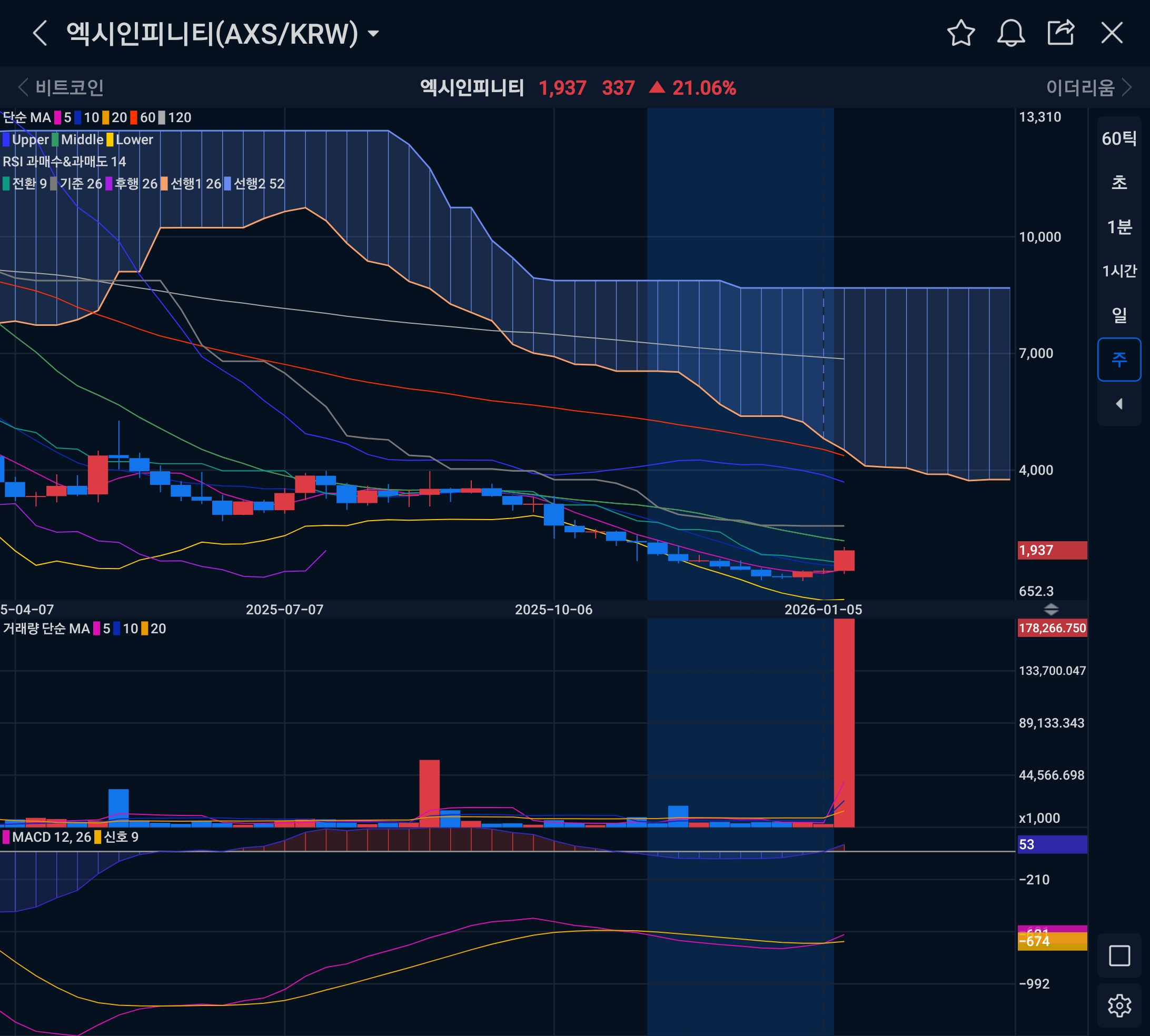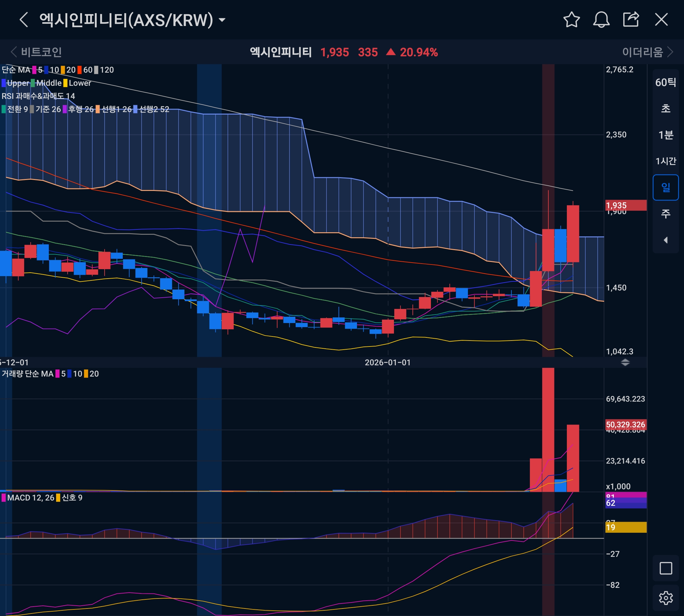 차트를 보면 AXS는 오랫동안 1,000원 초반~중반에서 눌려 있다가 최근 며칠 사이 장대양봉과 거래량 폭발로 1,900원 부근까지 수직 상승했다. 캔들이 일목 구름대 하단을 뚫고 올라오며 5·10·20일선이 전부 가격 아래로 말려 올라가는 초기 정배열 구간으로 진입했다.
