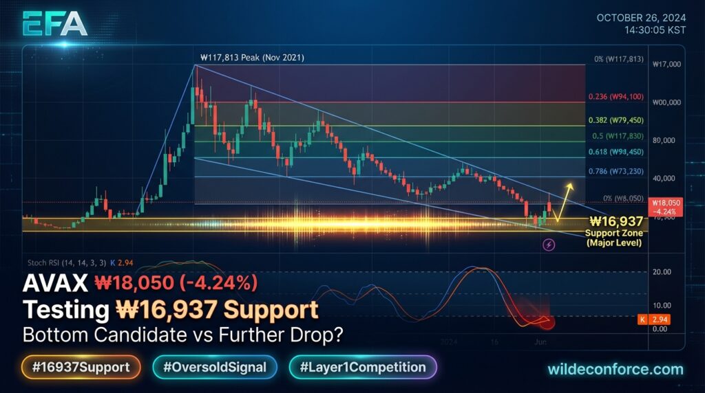 If AVAX defends ₩16,937 with long lower wicks and volume-backed buying, and Stoch RSI crosses up from extreme oversold levels, a technical bounce could unfold.