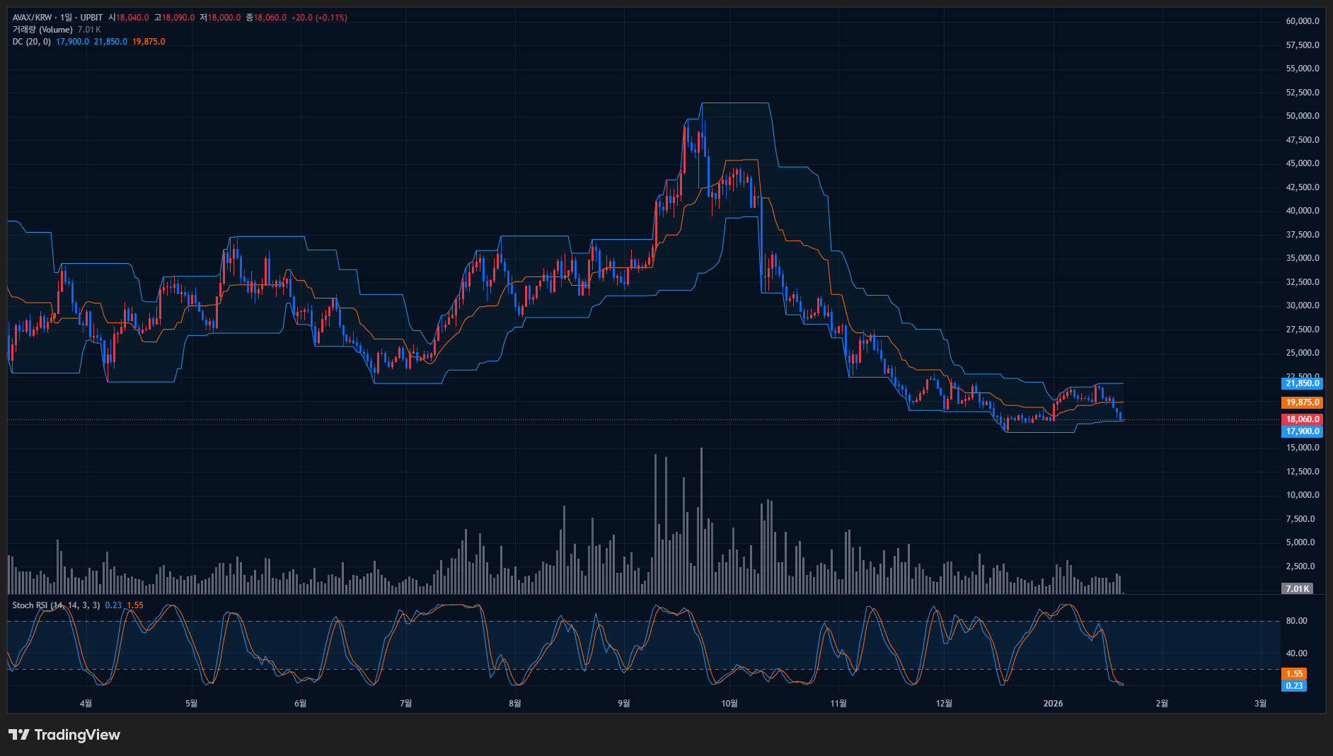 업비트 AVAX/KRW 일봉 차트에 20일 돈치안 채널을 적용하면 현재(2026.1.21) 상황은 다음과 같다.