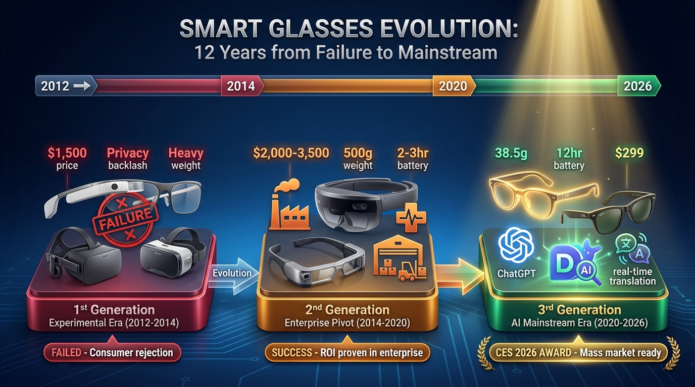 Smart glasses have evolved through three distinct phases: the 2012-2013 experimental era (Google Glass’s privacy backlash and Oculus Rift’s VR breakthrough), the 2014-2020 enterprise pivot (Microsoft HoloLens and Epson Moverio proving ROI in manufacturing/healthcare/logistics), and the 2020s AI-powered lightweight phase exemplified by Rokid Style winning CES 2026’s Smart Living Award.