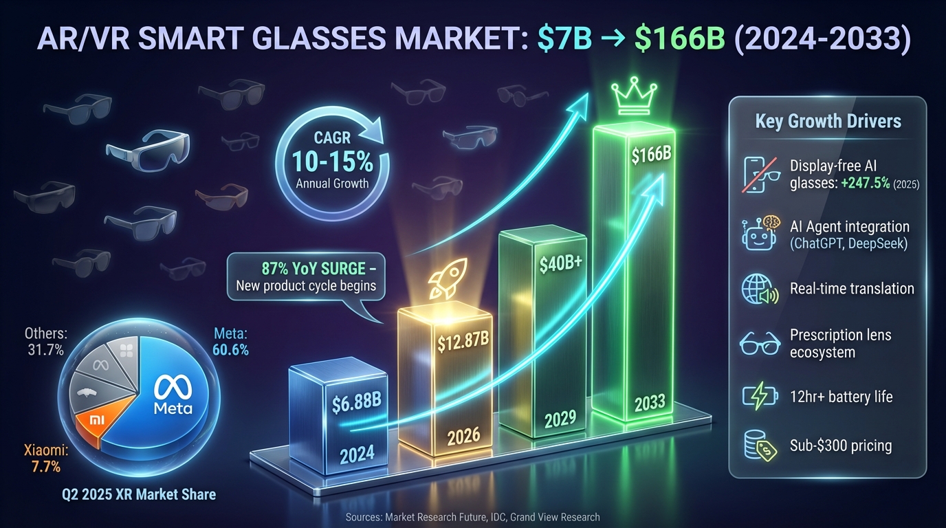 The AR/VR smart glasses market is experiencing explosive growth: valued at $6.88 billion in 2024, projected to reach $16.63 billion by 2033 (CAGR 10-15%), with 2026 expected to see ~87% year-over-year growth as new product cycles resume. Display-free AI glasses are leading this surge, with Meta Ray-Bans growing 247.5% in 2025 and Meta capturing 60.6% market share in Q2 2025 (followed by Xiaomi at 7.7% with its new AI Glasses).