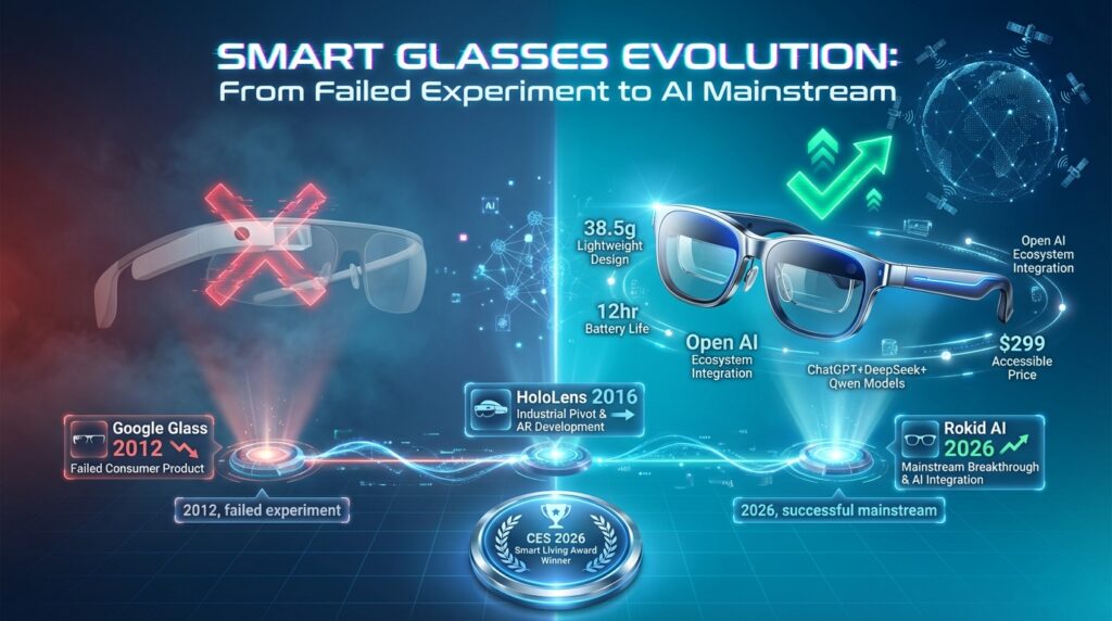 Smart glasses have evolved through three distinct phases: the 2012-2013 experimental era (Google Glass’s privacy backlash and Oculus Rift’s VR breakthrough), the 2014-2020 enterprise pivot (Microsoft HoloLens and Epson Moverio proving ROI in manufacturing/healthcare/logistics), and the 2020s AI-powered lightweight phase exemplified by Rokid Style winning CES 2026’s Smart Living Award.