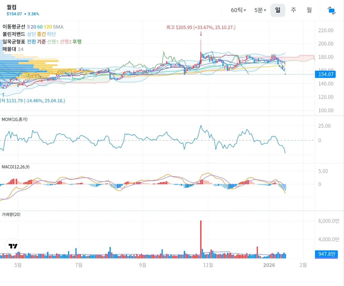 퀄컴이 150달러 근처에서 긴 아래꼬리와 거래량 동반 방어(또는 반등 시도)를 만들고, MACD·모멘텀이 완만한 바닥 신호를 보인다면 단기적으로 “하락 속도 조절” 또는 “기술적 반등” 가능성이 열릴 수 있다.