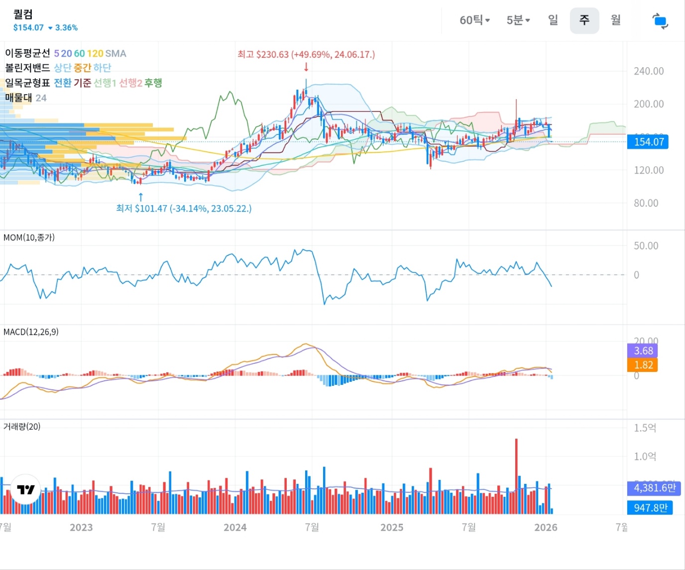- 핵심 리스크: 미즈호증권 Neutral 강등(목표가 200→175달러), 애플 자체 모뎀 개발로 핸드셋 비즈니스 점유율 하락 우려, 150달러 지지 이탈 시 130달러대 재검증 가능성