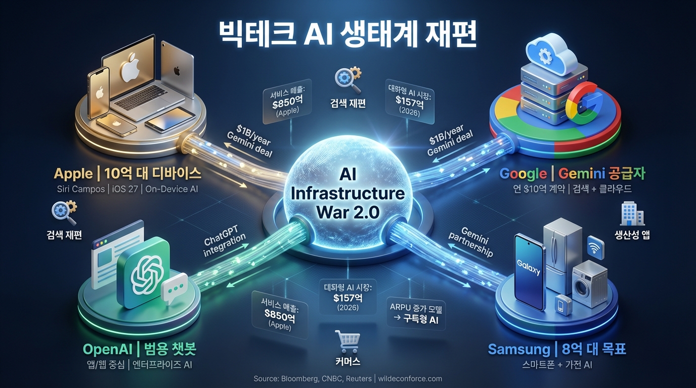 좌측: 애플 (OS 내장 / 10억+ 디바이스 / Siri Campos) / 중앙: 구글 (Gemini 공급 / 검색 지배력 / Android) / 우측: OpenAI (ChatGPT / 범용 챗봇 / 엔터프라이즈) / 하단: 삼성 (8억 대 AI 탑재 계획) / 배경: 글로벌 AI 시장 규모 성장 그래프