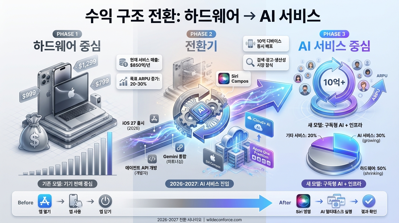 애플은 서비스 매출 ARPU 증가(월 5~10달러 AI 구독)와 기기 교체 수요(iPhone 17/18 슈퍼사이클)로 2026~27년 실적 서프라이즈 가능성이 있으며, 구글은 Gemini 공급 계약으로 iOS·안드로이드 양쪽에서 AI 인프라 수익을 확보하게 된다.