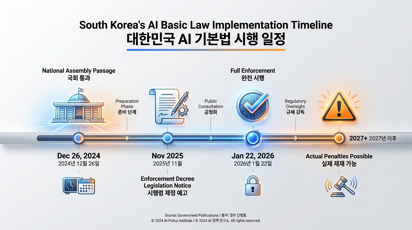 어제(1월 22일)부터 한국의 ‘AI 기본법’이 전면 시행됐다. EU AI Act보다 먼저 법을 시행한 건 세계 최초다. 정부는 “AI 산업 진흥과 안전·신뢰 기반 조성의 균형을 맞췄다”고 강조했지만, 현장에서는 “준비 시간이 너무 짧았다”는 목소리가 나온다.