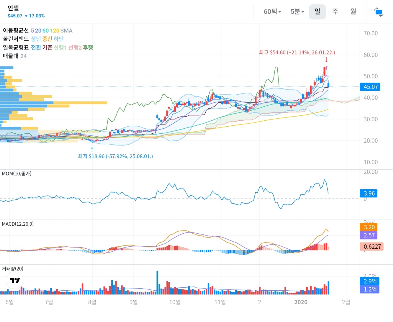 인텔 주가는 2025년 4월 17.66달러 저점에서 반등을 시작해, 2026년 1월 20일 54.60달러까지 상승하며 약 200% 넘는 강한 랠리를 보여줬다. 하지만 실적 발표 이후 가이던스 쇼크로 급락하면서 현재 45달러 부근까지 밀렸고, 고점 대비 약 17% 조정을 받은 상태다.