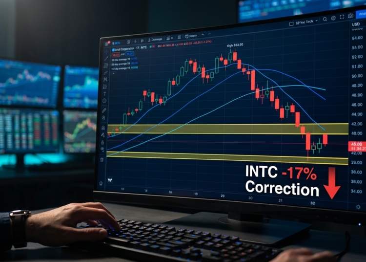 인텔 차트 분석 — 54달러 고점 후 17% 조정, 42~44달러 지지선 주목