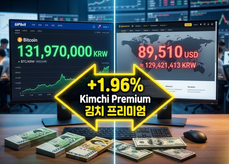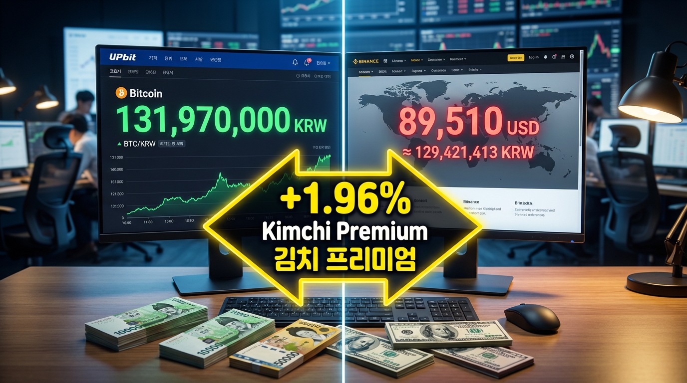 Kimchi Premium refers to the phenomenon where Bitcoin prices on South Korean exchanges (e.g., Upbit, Bithumb) trade at a higher price than on overseas exchanges (e.g., Binance, Coinbase) when converted to KRW. For example, if Upbit shows 131.97M KRW and Binance shows 129.42M KRW (USD price × exchange rate), the premium is approximately +1.96%. This price gap exists due to strong local demand and capital controls that limit arbitrage opportunities. 💰