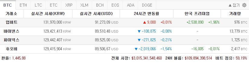 업비트 131,970,000원 vs 바이낸스 129,421,413원 | 프리미엄 +2,538,090원 (+1.96%) | 출처: 코인판